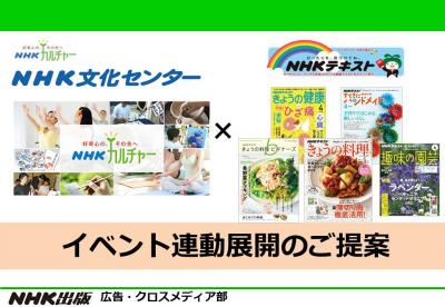 全国38教室、年間約60万人が受講している日本最大級のカルチャースクール 「NHK文化センター」でイベントプロモーションができます! NHK文化センターで講座を行い、NHKテキストにタイアップ展開でまと…