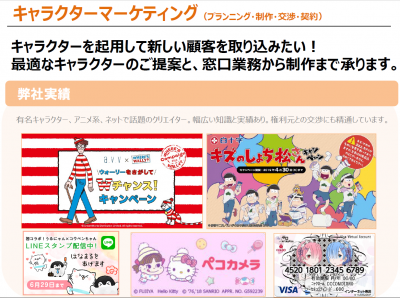 ◆ハローキティからコウペンちゃんまで【キャラクターマーケティング】 (プランニング・制作・交渉・契約) ------------------------------------------------------ キャラクターを起用して新しい顧客を取り込…